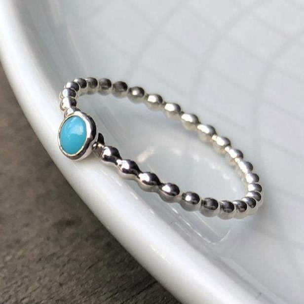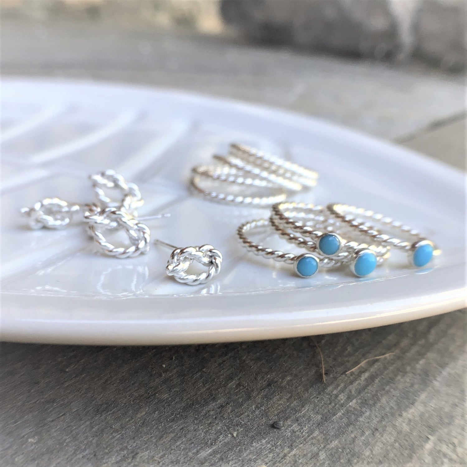 2 Smooth Style Silver stacking rings sandwich-ing a Mini Turquoise Rope Ring